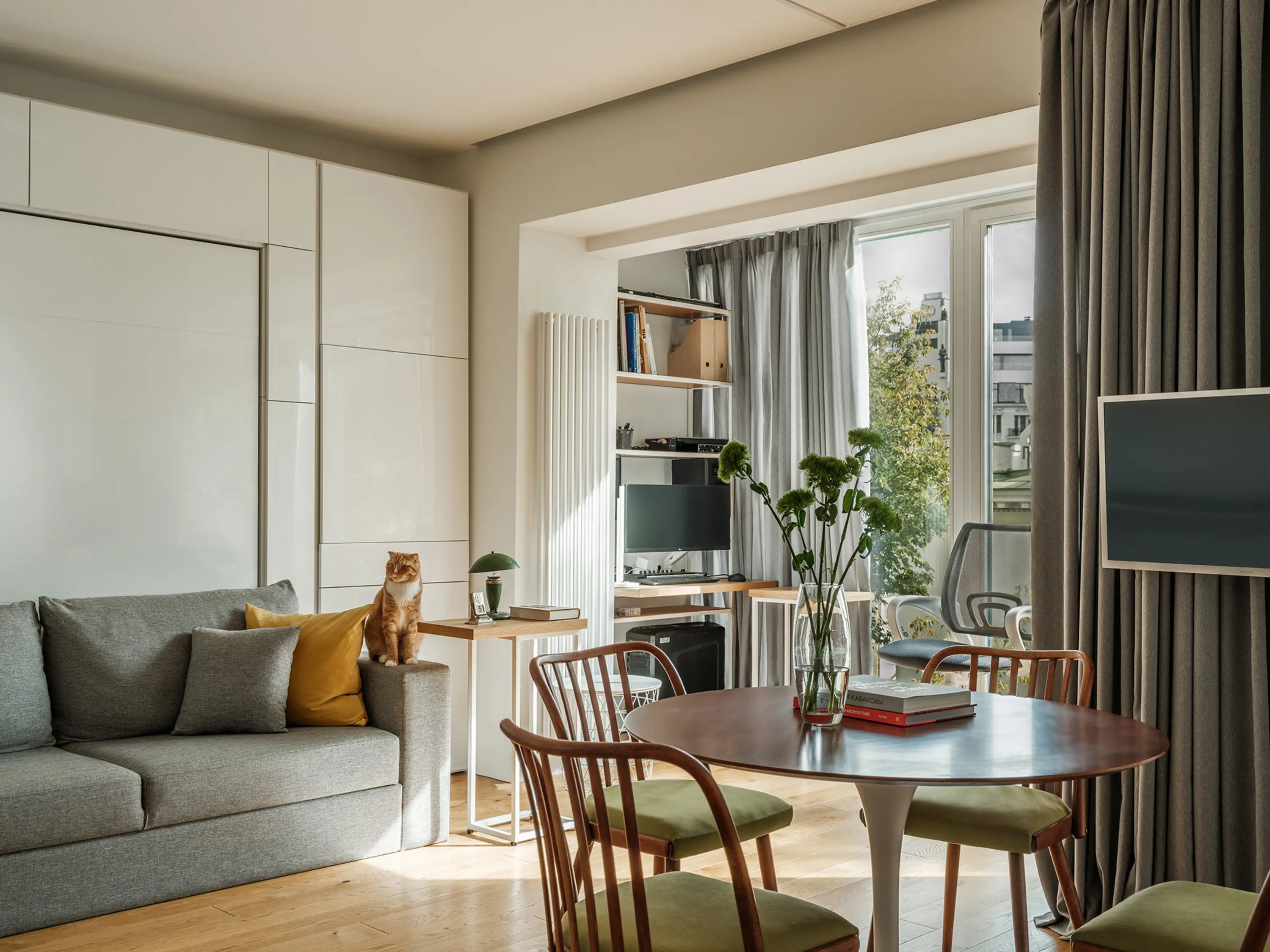 Небольшая однокомнатная квартира находится в доме 1980-х годов. Основными задачами при проектировании были: визуальное увеличение пространства, максимальное количество света и визуальное отсутствие габаритной мебели.